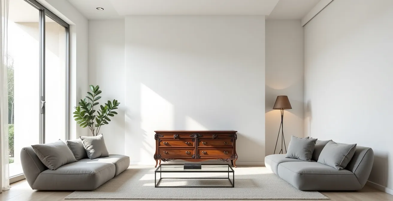 El error más común al integrar una pieza antigua es tratarla como un mueble más. Una cómoda barroca, con su marquetería, sus bronces y la pátina del tiempo, no es un simple contenedor; es una escultura funcional. Ahogarla entre otros muebles de fuerte personalidad o contra una pared con un papel pintado recargado es anular su poder. El principio fundamental de la curaduría es el respeto por la obra, y esto, en interiorismo, se traduce en un concepto clave: la respiración espacial. Una pared lisa, de un color neutro o incluso un tono profundo pero uniforme, actúa como un lienzo en blanco. Este fondo minimalista no compite, sino que enmarca la pieza, permitiendo que cada detalle, cada veta de la madera y cada reflejo del barniz se aprecien en su totalidad.